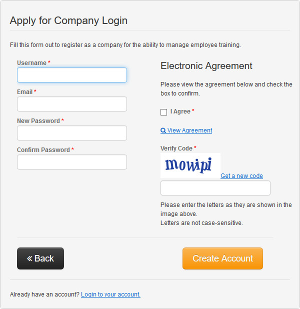 If you represent a company, owner site, or reciprocal council, you will need to apply for a company account. Creating an account as a company will allow you to register students and manage their training. Accounts for owner sites and reciprocal councils will allow you to look up student records. Select the Apply For Company Login button on the SORT Login & Accounts page to get started.