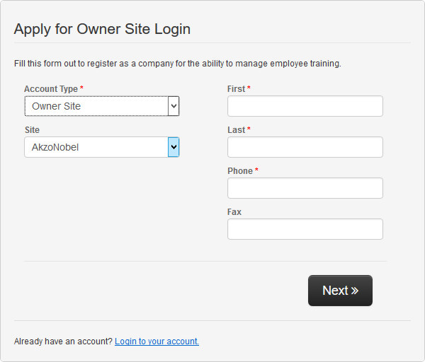 Next, fill out the the first page of information, making sure to include as much information as possible. Note that all fields marked with a red asterisk (*) are required information. Be sure to select the appropriate Account Type. The information fields will be different for companies and owner sites/reciprocal councils. Click the Next button when all the information has been entered.